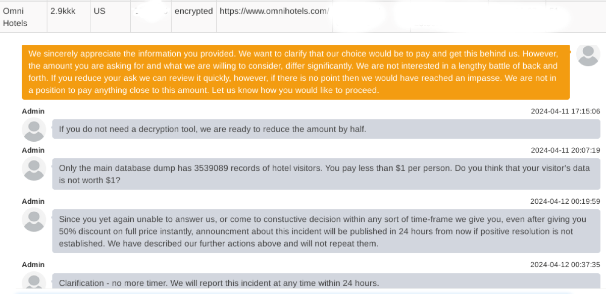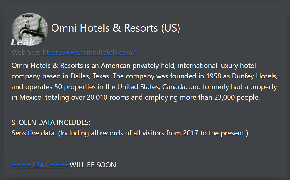 https://www.bleepingcomputer.com/news/security/daixin-ransomware-gang-claims-attack-on-omni-hotels/ https://databreaches.net/2024/04/14/omni-hotels-resorts-attack-in-march-now-claimed-by-daixin-team/