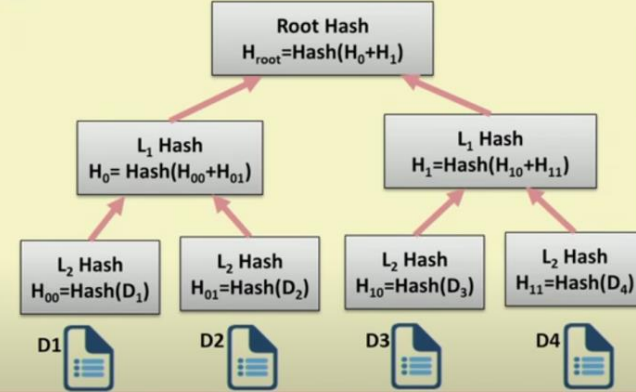 - Non-leaf nodes → Contain hashes of their child nodes.